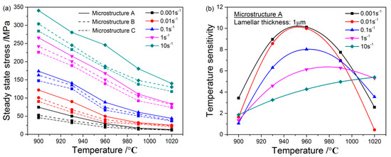 The steady state flow stress (stress at strain of 0.65 in the present work) changing with deformation temperatures for the alloy with three initial lamellar microstructures is shown in Figure 3a. It can be seen that the flow stress decreases rapidly with deformation temperature increasing from 900 °C to 960 °C, especially at a high strain rate, whereas the flow stress becomes less sensitive to temperature above the temperature of 990 °C. The work by Wanjara et al. [13] suggested that the transition trend in flow stress may take place at a temperature between about 70 °C and 40 °C below the β-transus temperature of the material, which concurs with the present result. The temperature sensitivity can be evaluated by a parameter S, defined as the following equation [2]: