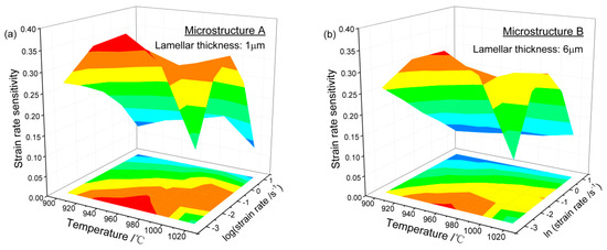 Based on experimental results, the temperature sensitivity parameters of the alloy with different initial lamellar microstructures and strain rates at a given true strain of 0.65 were obtained using Equation (1) and shown in Figure 3. The temperature sensitivity curves obtained exhibit almost a similar trend with the deformation temperature. Regardless of strain rate and initial microstructure, the sensitivity parameter displays a peak value at the temperature of 960 °C, which indicates that a fine grain structure of the alloy may be exhibited in this temperature range [2]. The values of the temperature sensitivity parameter are very small and less than 2 at a lower temperature (900 °C) and higher strain rates (1 s−1, 10 s−1), which implies that the alloy may exhibit instable flow under these conditions.