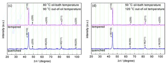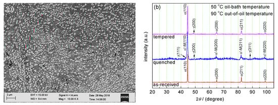 Figure 1a shows the microstructure of as-received commercial 51CrV4 steel used in this work. The microstructure of the as-received steel appeared to be spheroidite, in which many spherical carbides were distributed dispersedly in the ferrite grains. The XRD patterns of the as-received, quenched, and tempered specimens were analyzed. The XRD result of as-received steel showed a main phase of α-Fe (Figure 1b), which is the matrix of the microstructure shown in Figure 1a. The carbides had a small X-ray reflection and showed no peaks in the XRD result. Figure 1b–d shows the XRD patterns of specimens which were quenched at various oil-bath temperatures and out-of-oil temperatures. The quenched specimens showed a pattern of martensite, which appeared to have peak positions similar to the α-Fe phase. The pattern of quenched specimens in Figure 1b,c included the peaks of γ-Fe phase, indicating that retained austenite existed in the two specimens quenched at an out-of-oil temperature of 90 °C. In the two patterns of the tempered specimens that corresponded to the quenched specimens respectively, the lower peaks of γ-Fe phase indicated that the fraction of retained austenite decreased (Figure 1b,c). The patterns of 80 °C oil-bath temperature had a higher (200) peak of γ-Fe phase compared with that of 50 °C oil-bath temperature (Figure 1b,c), indicating that high oil-bath temperature enhances the fraction of retained austenite. On the contrary, the high out-of-oil temperature reduced the fraction of retained austenite. The quenched and tempered specimens at 120 °C out-of-oil temperature appeared to have no γ-Fe peaks in the pattern (Figure 1d).