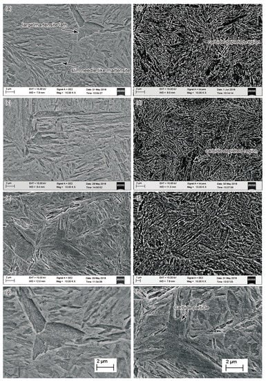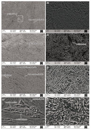 The temperature of workpieces decreased with an increase in submerged time during the quenching process. The surface temperatures of the steel bars were measured when they were taken out of the oil bath (out-of-oil temperature) to identify its effects on the microstructures. Figure 3a,c,e present the microstructures of steel bars quenching at various out-of-oil temperatures of 60 °C, 90 °C, and 120 °C respectively (The oil-bath temperature was 50 °C). Martensite was the main phase in the microstructures of all the three conditions. Both large-sized martensite laths and slim needle-like martensite existed in the microstructure. There was no significant discrepancy in the size of martensite laths in the specimens at various out-of-oil temperatures. Whereas, a high out-of-oil temperature of 120 °C enhanced the chance of auto-tempering in the microstructure, which led to the precipitation of many tiny carbide particles in the as-quenched martensite crystals (Figure 3h). In contrast, the carbide precipitation was not observed in the specimen at a low out-of-oil temperature such as 60 °C (Figure 3g), indicating that the auto-tempering was inhibited. The auto-tempering was more profound in the large-sized martensite lath. Morsdorf et al. found that the coarse martensite lath has a higher density of carbide particles compared to the thinner laths, which is due to the high degree of auto-tempering and lower dislocation density in the coarse laths [].