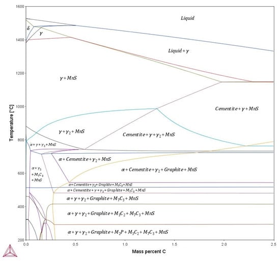 The phase diagram of 51CrV4 steel was shown in Figure 5, which was calculated based on the Thermo-Calc software. The composition of 51CrV4 steel was close to the eutectoid point. The A1 temperature was about 743 °C. There were several kinds of precipitations formed at various temperatures, including the MnS, the cementite, the M7C3 (carbide of Fe and Cr), the graphite, the M2P (phosphide of Fe and Mn), and the M3C2 (carbide of Fe and Cr). At the tempering temperature of this work, the M7C3-type carbides were precipitated. Moreover, MnS existed as inclusions at both soaking and tempering process. Graphite is predicted to precipitate below 600 °C in the phase diagram. However, graphite was not observed in the microstructure of this work.