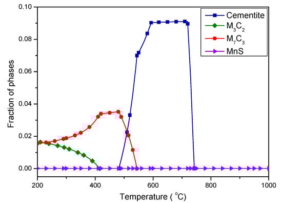 Figure 6 shows the mole fraction of precipitated phases changing with temperature, which was calculated using Thermo-Calc software. There are several kinds of carbide precipitations occurring below 740 °C, including the cementite, the M3C2-type, and the M7C3-type carbides. A significant amount of cementite is stable in the temperature range of 590–720 °C, whereas it rapidly decreases with decreasing temperature below 590 °C. The cementite is completely replaced by M3C2-type and M7C3-type carbides. M7C3 carbide reaches its largest fraction and remains stable in the temperature range of 420–480 °C, which covers the tempering temperature of this work, indicating that the carbides observed in Figure 2 and Figure 3 were mostly M7C3-type. The amount of M7C3 carbide is gradually reduced and replaced by M3C2 carbides below 420 °C.