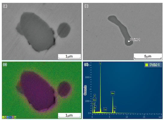 As indicated by the phase diagram (Figure 5), the MnS inclusions could exist in a large temperature range below 1400 °C. Figure 7a,b shows the morphology of several MnS inclusion particles, which was identified by EDS elemental mapping and point analysis. Figure 7c shows the corresponding EDS elemental mapping images of the inclusions in Figure 7a, which indicate that the main elements of the inclusions were Mn and S. Figure 7d shows the EDS point analysis of point 1 in the inclusion of Figure 7b. The composition appeared to be 40% Mn and 42% S, indicating that the inclusion was MnS.