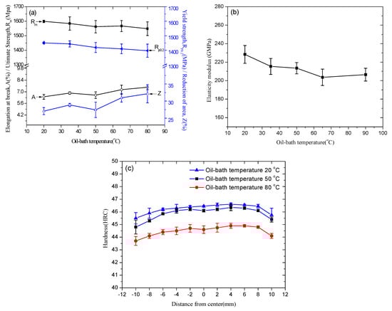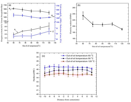 Mechanical properties of the steel bars at various out-of-oil temperatures: (a) ultimate tensile strength, yield strength, elongation at break, and reduction of area (The stress and strain are engineering value); (b) elasticity modulus; (c) rockwell hardness (HRC) of tempered samples.