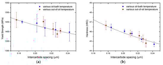 This implies that the yield strength and the hardness both decreased with increasing intercarbide in accordance with the Hall-Petch relationship. Both high oil-bath temperature and high out-of-oil temperature resulted in an increase in intercarbide spacing, which led to the decrease of strength and hardness.