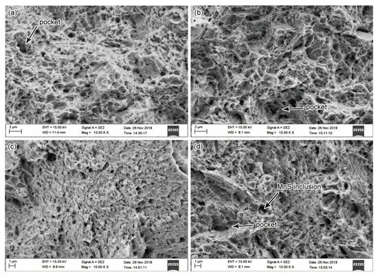 According to the above discussions on mechanical properties, both high oil-bath temperature and high out-of-oil temperature benefited the enhancement of the ductility, which correspondingly reduced the strength and hardness. These effects were further proved by the fracture analysis. Figure 11 shows the SEM microfractographs of the steel bars investigated. The fractures were uneven and showed random fluctuations. Fractures of all the four conditions were composed by dimple and quasi-cleavage morphology, which indicated the experimental steel had high toughness. Many deep dimples were observed, and many small dimples were distributed around large dimples. There were pockets existing in all the four conditions, which contained features that resemble localized quasi-cleavage. Figure 11a,b presents the fracture morphology of the specimens at 20 and 80 °C oil-bath temperatures, respectively. The specimen at 80 °C oil-bath temperature had a larger dimple size, indicating that this specimen had a higher ductility. Figure 11c,d shows the tensile fractures of tempered 51CrV4 spring steel bars at various out-of-oil temperatures. At 60 °C out-of-oil temperature, the dimples appearing in the tensile fracture were small and uniformly distributed, most of the dimples had sizes less than 1 μm. At 120 °C out-of-oil temperature, many large dimples with sizes larger than 1 μm were observed. Therefore, the fracture was more ductile at a higher out-of-oil temperature. The fracture morphology could explain the mechanical property results presented in Figure 8 and Figure 9. It is noted that a fine inclusion was observed in Figure 11d, and the inclusion was MnS compound according to the EDS analysis.