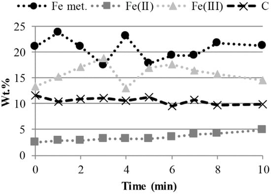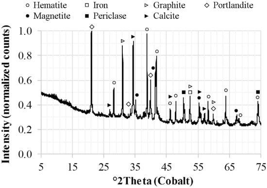 The mineralogical composition of the cold-bonded agglomerates is illustrated in Figure 1. The identified phases were: hematite (Fe2O3), magnetite (Fe3O4), iron (Fe), periclase (MgO), graphite (C), calcite (CaCO3), and portlandite (Ca(OH)2). Wüstite (FeO) was not present above the detection limit of the XRD. Thus, the Fe(II) content presented in Table 5 corresponds to the Fe(II) in magnetite. Furthermore, lime was not detected in the XRD suggesting that the calcium detected in the XRF was present as calcite and portlandite.