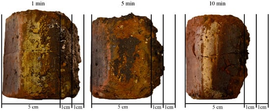 In the industrial process, the cold-bonded agglomerates would be charged to a ladle holding small amounts of HM. This HM is remaining desulfurized HM left over in the ladle when charging the BOF. The temperature of this HM was estimated to be 1350 °C. Thus, the temperature of the HM during the experiments in the 80 kg induction furnace was aimed for 1350 °C. Furthermore, in the industrial process, the time between charging the briquettes to the ladle, tapping HM from the torpedo car to the ladle and transporting the ladle to the HM deS plant is approximately ten minutes. Therefore, ten minutes was chosen as the longest time the briquettes were in contact with the melt in the technical-scale experiments. The propagation of the melt-in of the briquettes during these experiments is presented in Figure 2. A majority of the briquette is still to be melted after ten minutes.