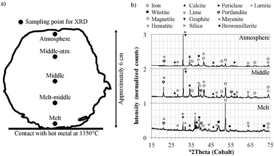 The mass loss during the smelting reduction was measured by recording the weight of each agglomerate before and after contact with the melt. The agglomerates were analyzed for the chemical composition using XRF, titration (ISO 9035) and LECO analysis. Furthermore, a PANalytical Empyrean X-ray diffraction (XRD) unit operating a cobalt tube (Malvern Panalytical, Almelo, The Netherlands) was used to determine the mineralogical composition.