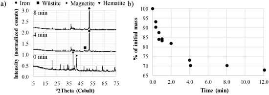(a) Diffractograms of cold-bonded pellets after contact with HM; (b) mass loss curve during the smelting reduction of cold-bonded pellets.
