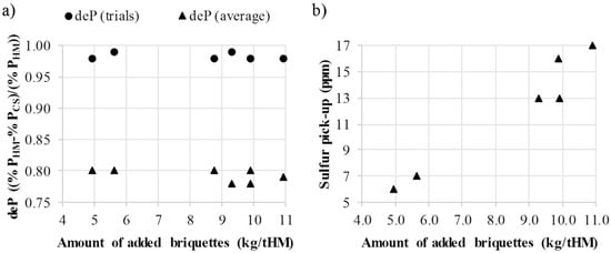 (a) Dephosphorization during the trials and the corresponding average for the steel code produced; (b) sulfur pick-up attributed to the briquettes calculated by mass balancing.