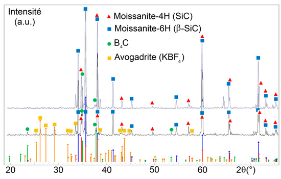 X-ray diffractogrammes of the pack powder before and after boriding are given in Figure 1. After treatment, the majority of B4C and KBF4 has disappeared, due to the diffusion of boron into the substrate, while silicon carbide and boron carbide are mostly spectators.
