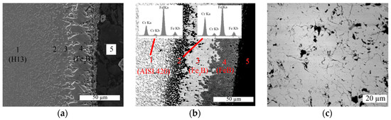 Figure 2a gives a cross-section of the surface, from the substrate (nr 1 on the figure) to the resin used to imprison the sample (nr 5). Small carbides can still be found in-depth (i.e., in region nr 1), which means that the heat treatment did not affect the steel microstructure in depth. The Fe2B boriding layer has quite pronounced “teeth” (nr 4 in Figure 2a). Its average thickness is 25 µm, in agreement with results from [9] in similar conditions.