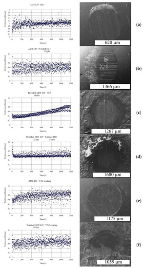 Friction coefficient as a function of time and post mortem ball (SEM, secondary electrons, front views): (a) Ball: AISI 420, disk: H13; (b) Ball: AISI 420, disk: Fe2B layer; (c) Ball: FeB layer, disk: H13; (d) Ball: FeB layer, disk: Fe2B layer; (e) Ball: AISI 420, disk: yttria-stabilized zirconia (YSZ) coating; (f) Ball: FeB layer, disk: YSZ coating. The scales on the right are adjusted to the average diameter of the tracks.