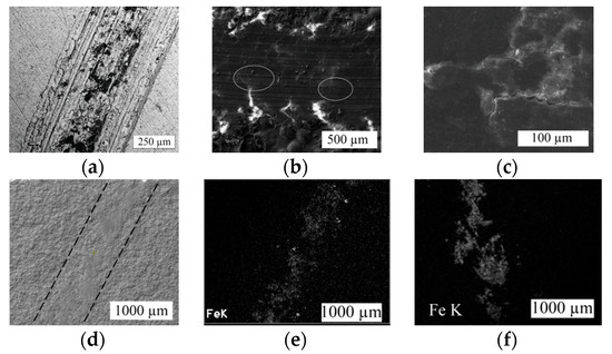 Wear tracks on disks (SEM, front view): (a) AISI 420 against H13, backscattered electrons; (b) Cracks on worn borided H13 (ball: untreated AISI 420), secondary electrons; (c) Same as (b), but with borided AISI 420 ball; (d) Borided AISI 420 against YSZ, backscattered electrons; (e) Same track as (d): mapping of iron Kα ray signal, (f) Similar track on YSZ worn by untreated AISI 420.