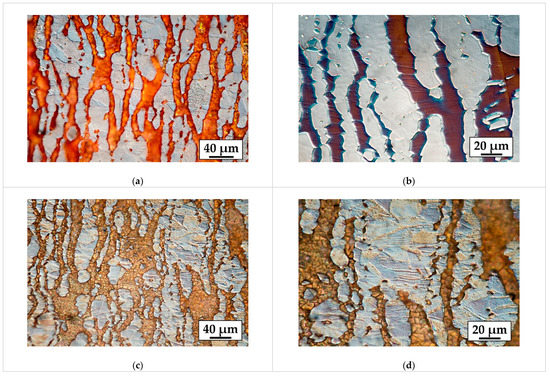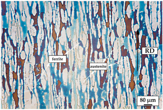 The microstructure of the UNS S32750 SDSS base material is shown in Figure 1. The picture depicts a biphasic microstructure with approximately equal volume fraction of ferrite and austenite. Austenite phase (white) is orientated along the rolling direction (black arrow) dispersed in a ferrite matrix (blue–brown).