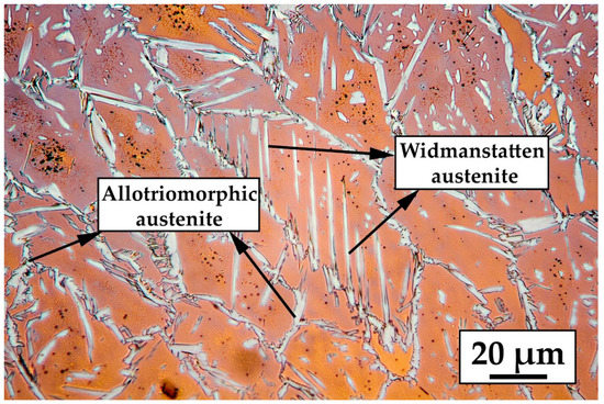 As previously mentioned, the weld zone solidifies initially fully ferritically and partially transforms into austenite through solid-state transformation as the temperature decreases. Because of the high cooling rate of laser welding, this transformation tends to be inhibited, resulting in a strongly unbalanced microstructure mostly consisting of ferritic phase [8,9,29]. It is clear from the micrographs in Figure 5 that the welded zone is mainly composed of massive ferrite grains, with a low volume fraction of austenite that grew both at ferrite grain boundaries and within the ferrite grains. Austenite nucleated at ferrite grain boundaries is allotriomorphic austenite while the elongate needle-like grains that grows from the grain boundary towards the ferritic grains is Widmanstätten austenite (Figure 5). The polygonal grains of austenite inside ferritic grains could be isomorphic austenite, Widmanstätten austenite emanated from the grain boundary below the surface or fragmented Widmanstätten austenite due to the decomposition of the austenite phase at lower temperatures as other researchers found [40,41].