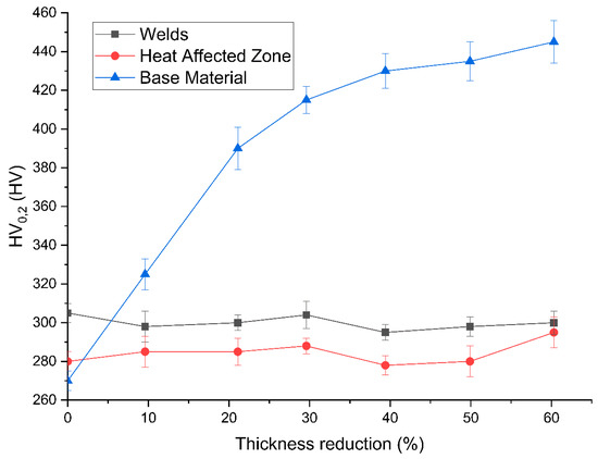Evolution of hardness with respect to thickness reduction for the welds, the HAZ and the base material.