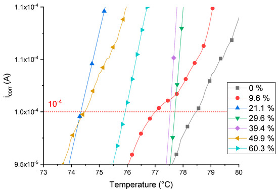 Close-up of the region of interest of the critical pitting temperature (CPT) curves of welded sheet metal.