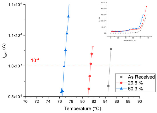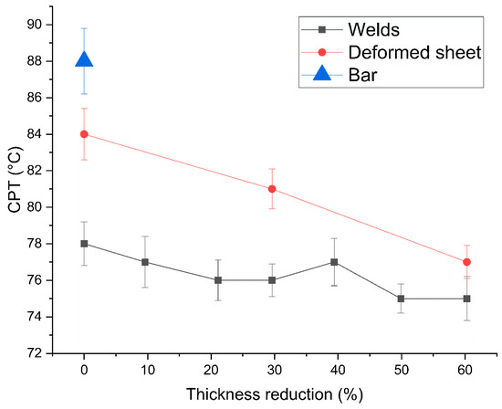 The cold rolling process and the welding affect the corrosion resistance by lowering the CPT [14,45]. The increase in deformation causes a gradual drop of the CPT as can be observed in Table 4: the higher the thickness reduction the lower the CPT as shown by the measurement done in the unwelded samples. CPT varies from a maximum of 88 °C for the bar to a minimum of 77 °C for the maximum thickness reduction (60.3%).
