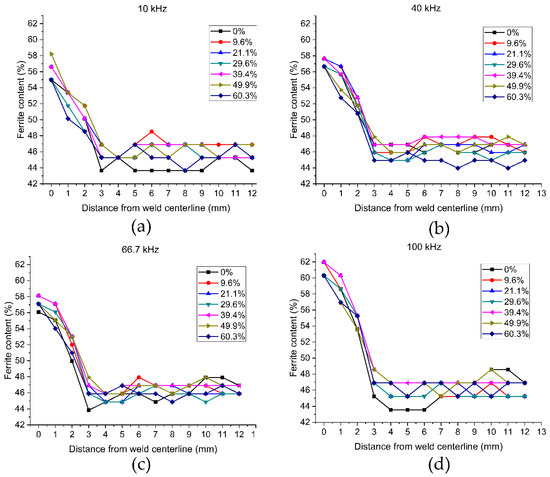 In accordance with previous studies [8,9,32,33], it can be seen that the amount of ferrite in the weld zone (~60%) is remarkably higher compared to the base material (46,9%) due to the high cooling rate typical of the laser welding. The precise ferrite content in the HAZ could not be measured because the dimension of the eddy current probe was significantly bigger (~1 mm) than the extension of the zone (~50 µm). However, the tendency of the ferrite content to decrease with increasing distances from the middle of the weld is quite clear for every frequency; the 40 kHz frequency was the most sensitive to the ferrite content variation. High heat input and small spot size of the laser combined with the fast welding process translates in narrow melted region (approximately 0.8 mm according to Figure 2) which limits the width of the HAZ thanks to the base material acting as a heat sink.