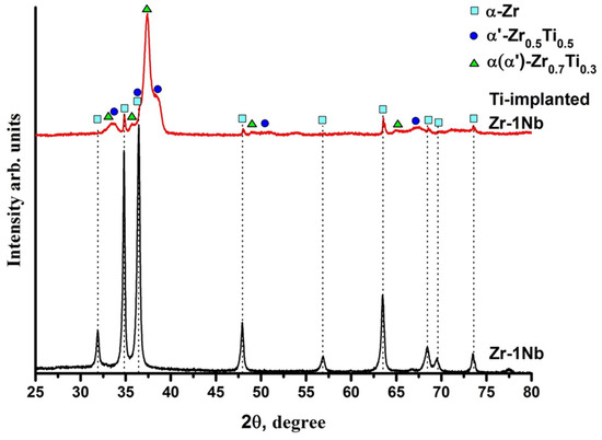 Figure 2 shows X-ray diffraction analysis of Ti-implanted and as-received Zr-1Nb alloy. It can be observed that the as-received alloy is characterized by hexagonal close-packed (hcp) crystal structure with the lattice parameters a = 3.2364 Å and c = 5.1451 Å. The crystal structure of the surface layer significantly changed after high-intensity Ti ion implantation. In addition to the α phase of zirconium, intermetallic phases based on Zr-Ti compounds were formed. The Zr-Ti phases also had hcp α(α′) structure of different compositions: Zr0.5Ti0.5 (54 vol.%) and Zr0.7Ti0.3 (43 vol.%). The calculated values of lattice parameters of the phases and microstrains are presented in Table 1. It can be observed that the fraction of the residual α phase in the investigated volume is 4% after Ti ion implantation. A decrease in the lattice parameter a and an increase in the parameter c of α phase are observed. Therefore, the lattice distortion (increase in the c/a ratio) of the α zirconium phase occurs, which is most likely related to the formation of crystal lattice defects caused by incorporation of Ti atoms into Zr lattice. Higher microstrains after implantation also indicate the crystal lattice deformation.