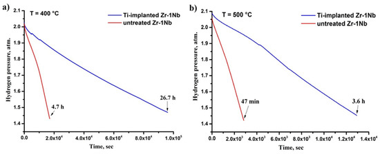 Hydrogen pick-up curves at (a) 400 °С and (b) 500 °С.