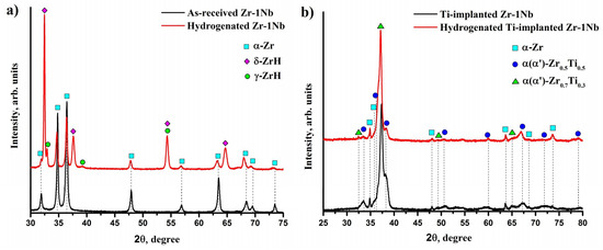 The crystalline structure of the hydrogenated samples is shown in Figure 5. The calculated phase content and lattice parameters are presented in Table 3. Zirconium hydrides with the cubic crystal structure (δ-ZrH1.66) and tetragonal γ-ZrH are detected in hydrogenated Zr-1Nb alloy. The content of δ hydrides in the analyzed depth is 53 vol.%. The α-Zr phase is also presented in the structure. However, the ratio of lattice parameters c/a of the α phase increased from 1.590 (as-received state) to 1.596 due to distortion of the crystal lattice by hydrogen dissolution. Inverse relationship (decrease in c/a ratio) is observed in the Ti-implanted samples. The latter may indicate that the presence of Ti in Zr lattice affects the position of hydrogen in the α phase. At the same time, a decrease in the intensity of α′-Zr0.5Ti0.5 reflex at the position of 2θ = 38.2° and an increase of the reflex at 2θ = 33.5° are observed (Figure 5b). The calculated phase composition indicates a decrease in the content of martensitic α′-Zr0.5Ti0.5 phase relative to the α(α′)-Zr0.7Ti0.3 phase (Table 3).