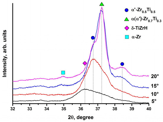 Figure 6 shows the XRD patterns recorded at different X-ray incidence angles (θ). It can be observed that the surface layer is primarily composed of α′-Zr0.5Ti0.5 phase (Figure 6 at θ = 5–10 degrees). In accordance with the results of the depth distribution of hydrogen and measured H concentration in the sample, we assume that the reflection at the position of 36.25° (θ = 5°) is attributed to TiZrH hydrides with fcc lattice structure. The intensity of α′-Zr0.5Ti0.5 reflections decreases while the reflection of α(α′)-Zr0.7Ti0,3 increases with analyzed depth (θ from 5 to 20°). This result indicates that the content of α(α′)-Zr0.7Ti0.3 is higher in the depth of Ti-implanted layer.
