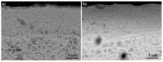 Microstructural analysis was performed on chemically etched samples before and after hydrogenation. The Ti-implanted layer, as mentioned above, consists of a lamellar microstructure with two pronounced layers: the upper layer with typical martensitic microstructure and the lower layer with elongated plates of α (TiZr) phase (Figure 7a). The latter seems to grow inside the primary β (TiZr) grains during cooling. Hydrogenation of the Ti-implanted layer has resulted in refinement of the lamellar plates and formation of a more homogeneous microstructure (Figure 7b). The upper layer with the thickness of about 1–2 µm has finer non-lamellar structure, which is probably attributed to the fragmentation of lamellar martensitic plates by TiZr hydrides precipitation.