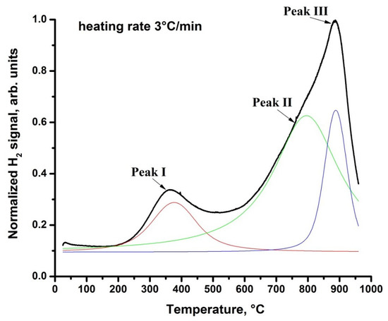 The characteristic of hydrogen desorption from hydrogenated Ti-implanted alloy was evaluated using thermal desorption spectroscopy. Figure 8 shows the TDS spectra of the Ti-implanted Zr-1Nb alloy at the heating rate of 3 °C/min. It can be observed that hydrogen release starts at approx. 250 °C. Deconvolution of the TDS spectra reveals one low-temperature peak (Peak I) and two high-temperature peaks (Peak II and III). The first peak corresponds to hydrogen desorption from the δ(Ti,Zr) hydrides followed by δ → β + δ → β(Ti,Zr) transformation in the implanted layer occurring at the valley between Peak I and Peak II. There are no published results related to decomposition of TiZrH hydrides, but the similar low-temperature desorption peak at 350–450 °C has been observed by many authors who studied the desorption of hydrogen from TiH hydrides [43,44]. In addition, in situ X-ray diffraction studies also indicate hydrides decomposition at these temperatures [45,46]. It is believed that the decomposition temperature of TiZrH hydrides is lower than that of δ-TiH or ZrH hydrides due to a reduced β transus temperature of TiZr compounds and β stabilizing effect of hydrogen. The next hydrogen desorption peak is related to equilibrium hydrogen pressure in the β(Ti, Zr) phase of the implanted layer and decomposition of δ zirconium hydrides in the alloy matrix followed by δ → β + δ → β(Zr) phase transformations [47]. According to Zr-H phase diagram, Peak III is attributed to the equilibrium hydrogen pressure of β(Zr) phase, therefore, corresponding to desorption of hydrogen from bcc β(Zr) phase of the zirconium alloy.