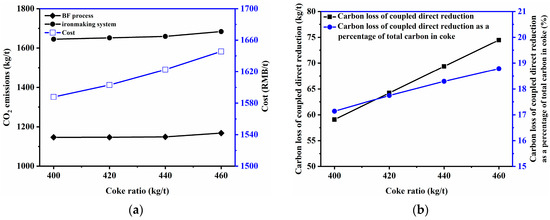 Figure 1. (a) Effect of coke ratio on cost and CO2 emissions; (b) Effect of coke ratio on carbon loss of coupled direct reduction and its percentage of total carbon in coke.
