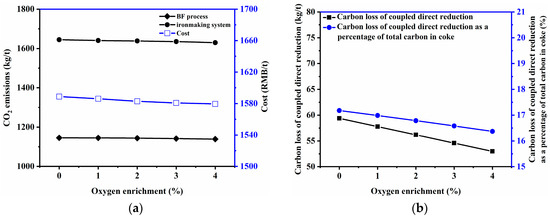 Figure 5. (a) Effect of oxygen enrichment rate on cost and CO2 emissions; (b) Effect of oxygen enrichment rate on carbon loss of coupled direct reduction and its percentage of total carbon in coke.