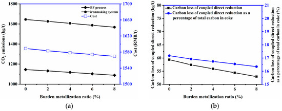 Figure 6. (a) Effect of burden metallization ratio on cost and CO2 emissions; (b) Effect of burden metallization ratio on carbon loss of coupled direct reduction and its percentage of total carbon in coke.