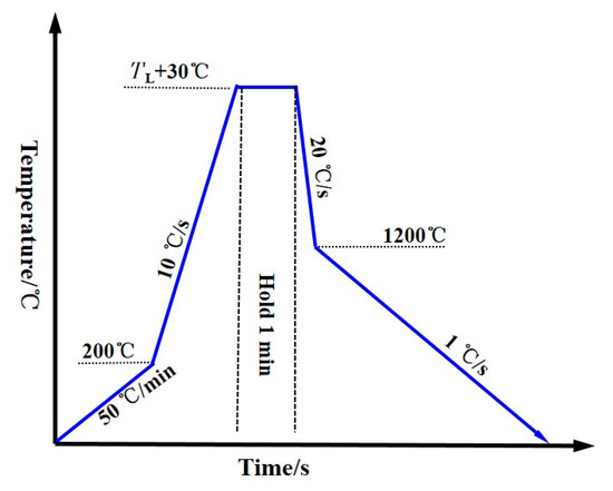 The experimental steel slab was cut into cylindrical specimens with a diameter of 7.8 mm and a height of 2.5 mm, then sanded and polished with sandpaper. Using CSLM to simulate the solidification process of the sample, the thermal scheme of the steel sample is shown in Figure 1. The temperature of the steel sample was raised from room temperature to TL + 30 °C with a rate of 10 °C/s, which was then was held for 1 min to ensure the complete melting of the steel sample. Where TL represent the melting temperature of the steel sample. Next, a quick cooling rate of 20 °C/s was applied to cool the samples to 1200 °C. Finally, the sample was cooled to room temperature with a cooling rate of 1 °C/s. The cooling air was high purity argon (6 N) and a video was recorded at 20 frames per second during the cooling process. The heating system was turned off, and then the surface roughness of the solidified steel samples at room temperature was measured using a laser confocal microscope.