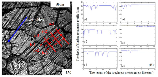 In order to verify the accuracy of the surface roughness, 0.54C% high carbon steel was selected as the reference steel. There is no δ→γ transformation in 0.54C% high carbon steel, so the surface roughness can only be caused by the low temperature phase transition. Figure 3 shows the surface measurement area of the 0.54C% high carbon steel. The blue arrow shows the direction of the surface wrinkles. Guo et al. [20] made the measurement line perpendicular to the direction of the surface wrinkles, as seen a-1–a-3 in Figure 3. The results of the a-method are displayed, where the value of surface roughness Ra was 10.43 μm. However, when the surface roughness measurement line was along the direction of the wrinkles (measurement line “b”, for example), the value of the surface roughness Ra was less than 1 μm.