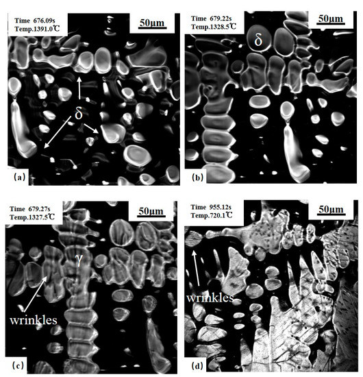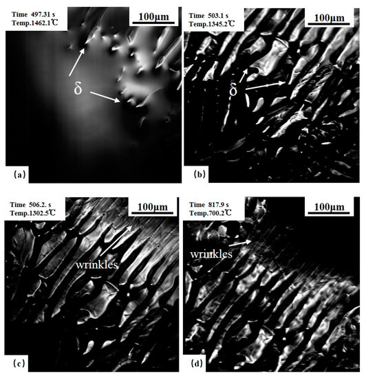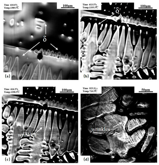 Confocal scanning laser microscope (CSLM) results of the 0.10C% steel. (a) δ growth; (b,c) before and after δ–γ transformation; (d) the wrinkles of low temperature phase transformation.
