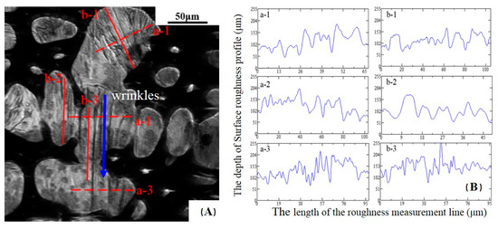 Typical surface roughness profile curve of S1 (A) the direction of the measuring line; (B) the surface roughness value of different measuring line.