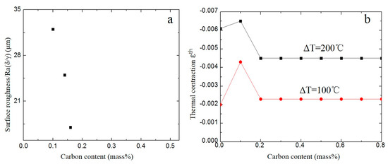 (a) relationship between the surface roughness and carbon content; (b) influence of carbon content on thermal contraction of iron-carbon alloys at different undercooling ΔT [11].