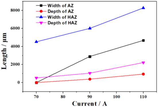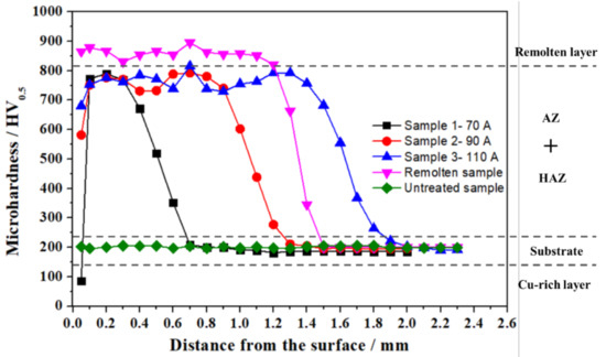 - The microhardness of the alloyed coatings is significantly improved and is approximately four times higher than that of the untreated sample. However, it is slightly lower than that of the remolten sample, due to the dissolution of the Cu particles. With the increase in the PTA current, the location of the maximum microhardness of the PTA alloying samples becomes further away from the surface.