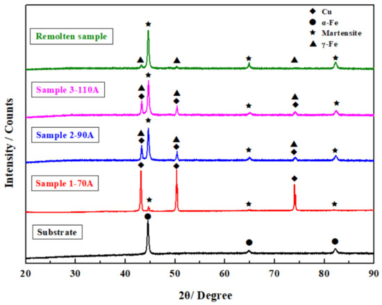 - The microstructures of the alloyed coatings are distinctly influenced by the arc current. After PTA alloying at 90 A and 110 A, the alloyed coating is composed of bamboo-like martensite, retained austenite, and Cu-rich particles. Cu-rich particles are gradually embedded in the substrate because of the liquid phase separation and high cooling rate of the PTA process.