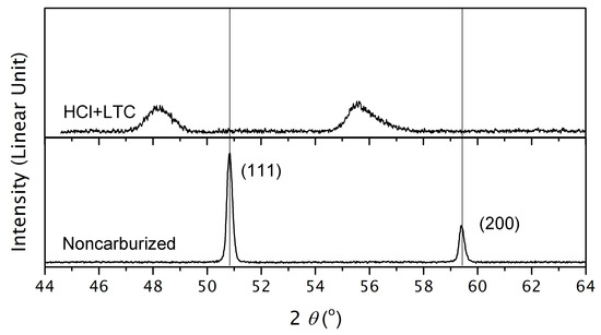 After low-temperature carburization with HCl activation, the corresponding peaks are shifted to lower diffraction angles, indicating increased interatomic distances between the metal atoms. The peak shift is almost twice the peak shift observed for AISI-316L reported in Reference [4], consistent with the maximum carbon fraction also being almost twice as large. The peaks are also broadened. This can be attributed to two effects: (i) As the carbon profile is graded, the peak shape corresponds to a weighed average over lattice plane spacings that decrease with increasing depth below the alloy surface. (ii) A high dislocation density caused by stress that builds up between the region of expanded interatomic distances at the surface and the noncarburized alloy core [20].