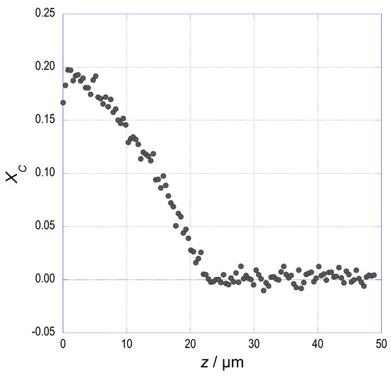 Figure 4 shows a carbon profile measured on the cross-sectional AISI-AL-6XN specimen by scanning Auger microprobe. Defining the case depth as the depth at which the signal vanishes in the background noise, the case depth is m, which is comparable to the case depth suggested by the metallographic images in Figure 2. As expected, the maximum carbon fraction is observed at the surface: . The carbon profile gradually decreases with increasing z, exhibiting a concave shape characteristic of a diffusion coefficient that increases with increasing [21].