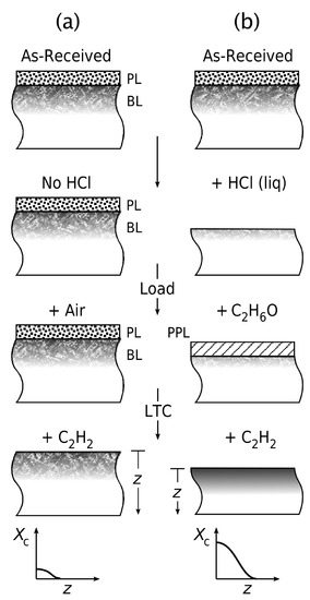 Figure 5b shows the corresponding stages with external activation: External etching in concentrated aqueous HCl removes the passivating oxide layer and the Beilby layer—or at least the (presumably uppermost) subzone of the Beilby layer that inhibits carbon diffusion. Storing in CHOH results in a provisional passivating layer. This provisional layer protects the alloy surface against the reformation of the Cr-rich passivating oxide film. At the beginning of the low-temperature carburization process, the increasing temperature and interaction with CH readily remove the provisional passivating layer, exposing a fully activated surface to the carburizing gas. This results in a fully-developed carbon profile.