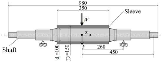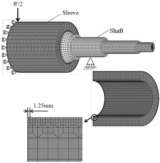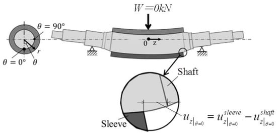 As shown in Figure 1, in the shrinkage fitted sleeve roll, the distributed load in actual rolling is replaced by the concentrated load W. In Figure 1, steel is used for both the shaft and the sleeve. Define the shrink fitting ratio δ/d as the ratio of the shrink fitting margin δ to the sleeve inner diameter d = 100 mm. Reference 6 indicates that the effect of δ/d on the residual deflection becomes smaller if shrink fitting ratio δ/d is larger than a certain value. The value used in this study δ/d = 1.0 × 10−3 is within this range, and this value δ/d = 1.0 × 10−3 was used in the experiment. Shrink fitting ratio δ/d can be provided in finite element method FEM simulation by using the option “interference closure” in MSC Marc /Mentat 2012 (Marc 2012, MSC.Software Corporation, Santa Ana, CA, USA). After the shaft and sleeve are assembled the tolerances δ can be applied by using this option.