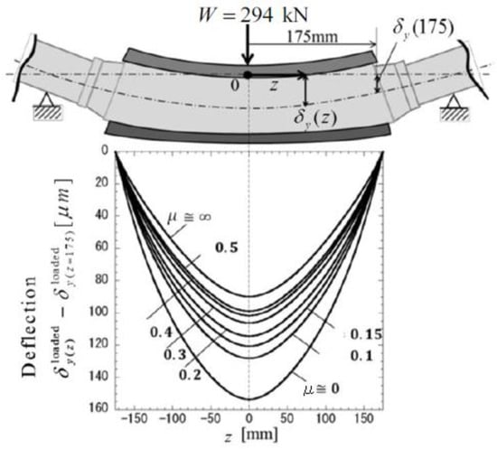 Figure 3 shows the analysis results by changing the friction coefficient μ under the fixed load W = 294 kN. From Figure 3, it can be seen that the deflection increases with decreasing μ. Figure 4 shows the obtained residual deflection after removing load W = 294 kN. In Figure 4, the experimental results by Shimoda et al. [,,,]. With μ = 0.2 are also plotted. It is seen that the simulation result coincides with the experimental result within 15 % error at the center of the roll. In Figure 4, since the detail of the experimental deflection shape was not indicated in the previous study, the deflection shape cannot be compared.