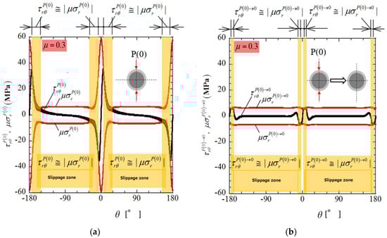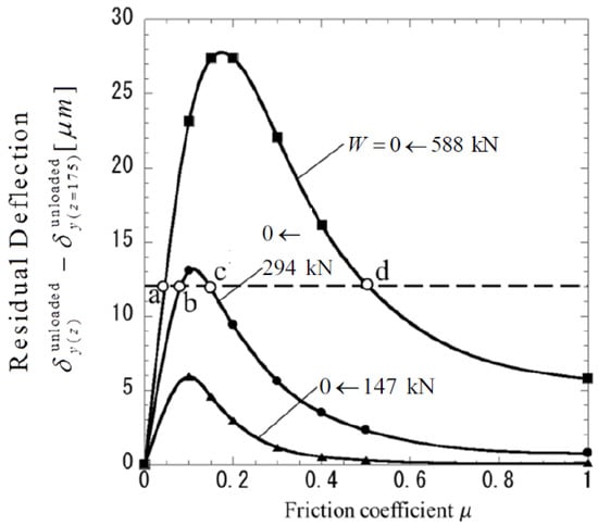 From the above discussion, the relative slippage may be involved in the occurrence of residual deflection. In this section, the stress state along the joint surface of the roll will be investigated and the slippage condition along the surface will be clarified. As shown in Figure 5, under W = 588 kN, the same residual deflection Δ = 12 μm can be obtained at Point “a” corresponding to μ = 0.04 and Point “d” corresponding to μ = 0.5. In a similar way, under W = 294 kN, the same residual deflection Δ = 12 μm can be obtained at Point “b” corresponding to μ = 0.07 and Point “c” corresponding to μ = 0.15. Those four points a, b, c, d have the same residual deflection but different load or different friction coefficient.