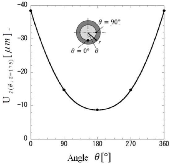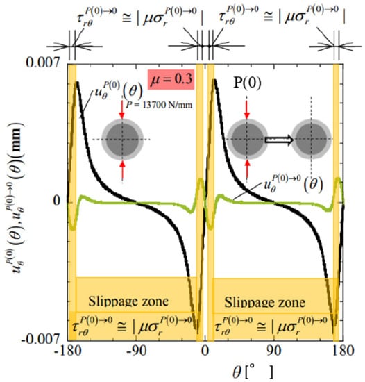 In the numerical simulation, the roll rotation is replaced by the load shifting on the fixed roll surface [,]. Here, two-dimensional rigid shaft and the elastic steel sleeve are assumed. Then, the interface slippage can be expressed from the interface displacement at the sleeve interface because of no displacement of the rigid shaft. In Section 4.2, it was shown that the residual deflection is caused by the relative slippage between the sleeve and the shaft. From the stress distributions along the shrink-fitted surface, the relative slippage condition was discussed in terms of the stress quasi-equilibrium region.