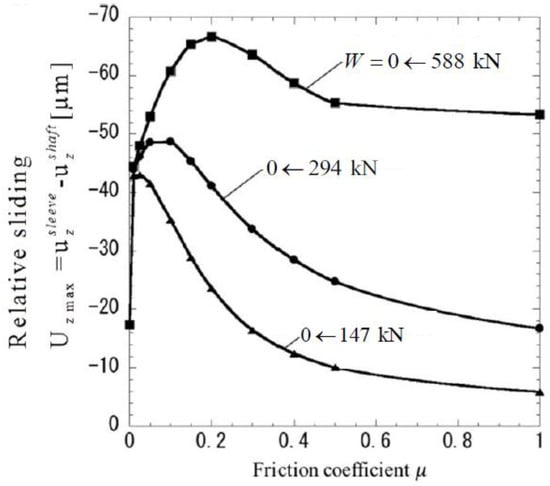 Figure 7 shows the relative slip distribution at the sleeve end at z = 175 along the circumferential direction. From Figure 7, we will focus on the maximum value of the residual relative slippage generated at the lower side of the roll θ = 0°. Figure 8 shows the effect of the friction coefficient on the residual relative slippage at the lower side of the roll θ = 0°after removing the load when W = 147 kN, 294 kN, 588 kN. From Figure 5 and Figure 8, when W = 294 kN, the residual deflection shows the maximum value at μ = 0.12 and the residual relative slippage shows the maximum at μ = 0.08. Both values are relatively close. Also, similar variations can be seen in the region where 0.3. In this way, it may be concluded that residual deflection and relative slip have almost the same trend.