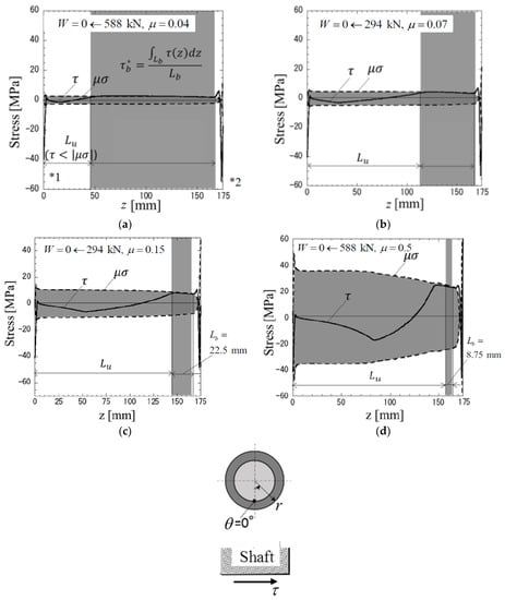 Figure 9 shows the shear stress distribution τ as a solid line and the friction stress distribution μσ as a broken line at Points a, b, c, d. In Figure 9, the peak values of τ around z = 0 mm and z = 175 mm may include some numerical errors as shown in Figure 9a. In this study, the region Lu where τ < |μσ| and the region Lb where τ ≅ |μσ| are considered. The region around z = 0 mm and z = 175 mm is not considered since the effect is negligible. The stress distribution is represented by the point deflection at the opposite side to the loading point θ = 0° and r = 50 mm where the relative slippage appears most. Here, and in the coordinate system are denoted by τ and σ, respectively.